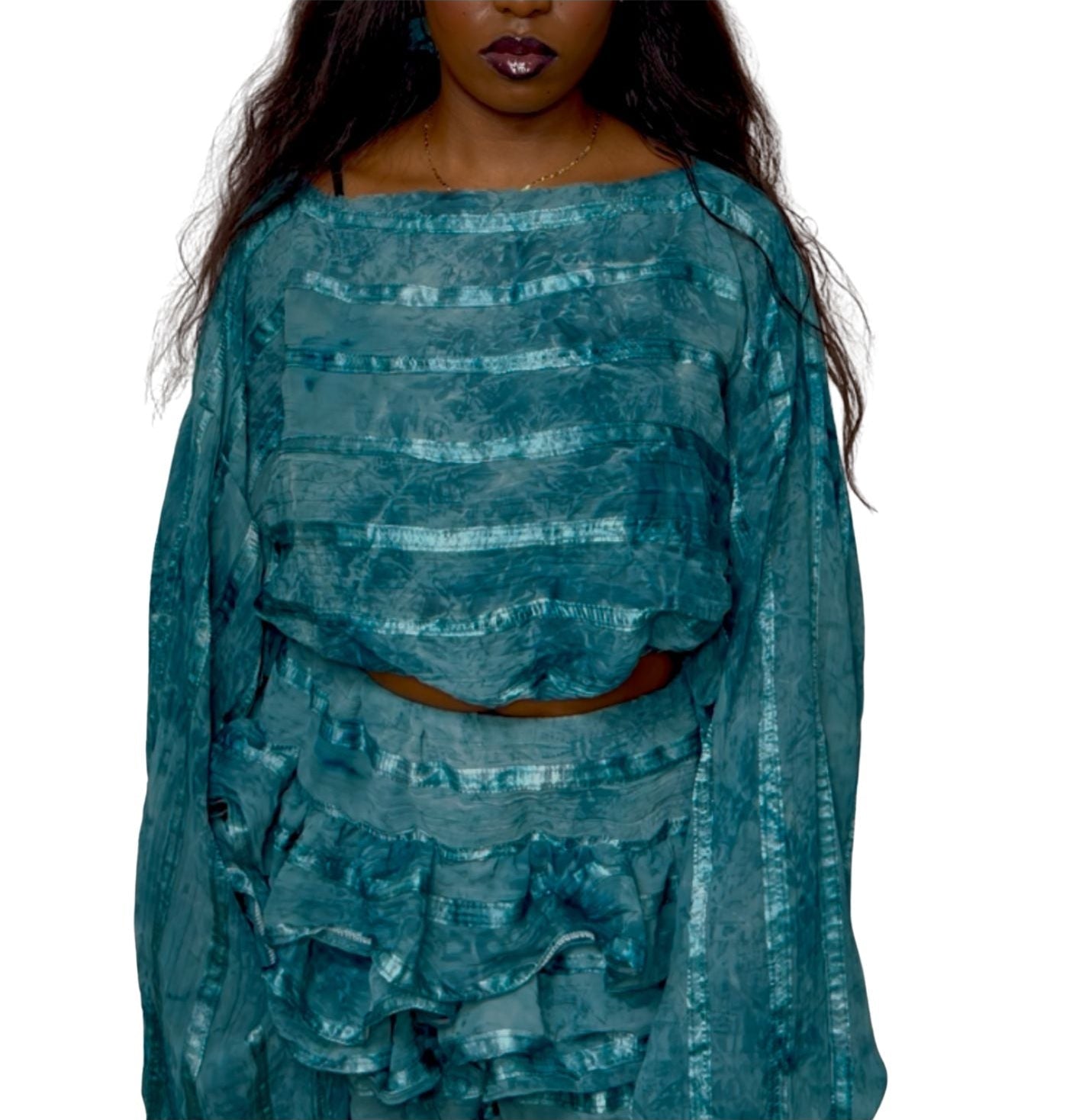 Made for the main character who's tired of pretending she isn't. This two-piece set features a rich teal green with sheer diagonal stripe detailing that catches the pink just right - think "dinner with the odogwus".